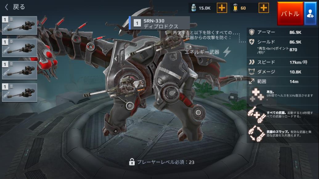 | 86900 | 86900(870) | 17 | 重4 | 再生 すべての武器 武器のスワップ | 20 15 10 | 10800 | 14 | 23 | 14000 10900 | メカ |
